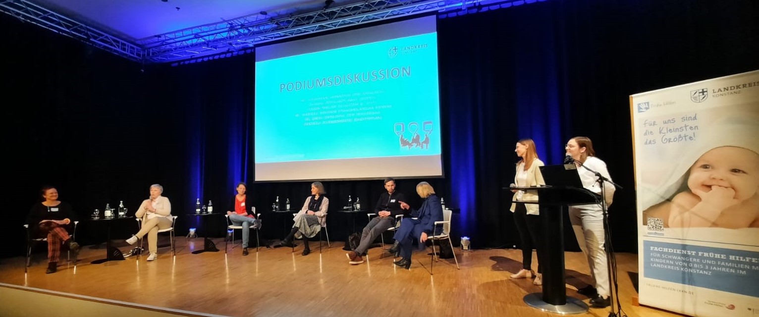 Die Podiumsdiskussion verband schließlich Theorie und Praxis: Neben Dr. Christiane Hornstein nahmen daran auch Carina Wolfer vom Verein Schatten & Licht, Dr. Gabriele Göhring aus dem Frauenklinikum Singen, Dr. Boris Kopeliovic vom Zentrum für Psychiatrie Reichenau (ZfP), Manuela Schreindorfer vom Babyforum Landkreis Konstanz sowie Claudia Mühlhoff-Mast als Vertreterin des Projekts „Singener Kinder psychisch kranker Eltern“ (SKIPSY), teil. Dabei gingen sie auf ihre jeweiligen regionalen Angebote und deren Zugangswege für betroffene Eltern ein, schilderten Belastungsmerkmale ihrer Klientinnen und Klienten und gaben Tipps für die Begleitung psychisch belasteter Schwangerer und Eltern. Die Thematik stieß auf reges Interesse beim Publikum, das sich mit einer Vielzahl an Fragen an die Expertinnen und Experten wandte.