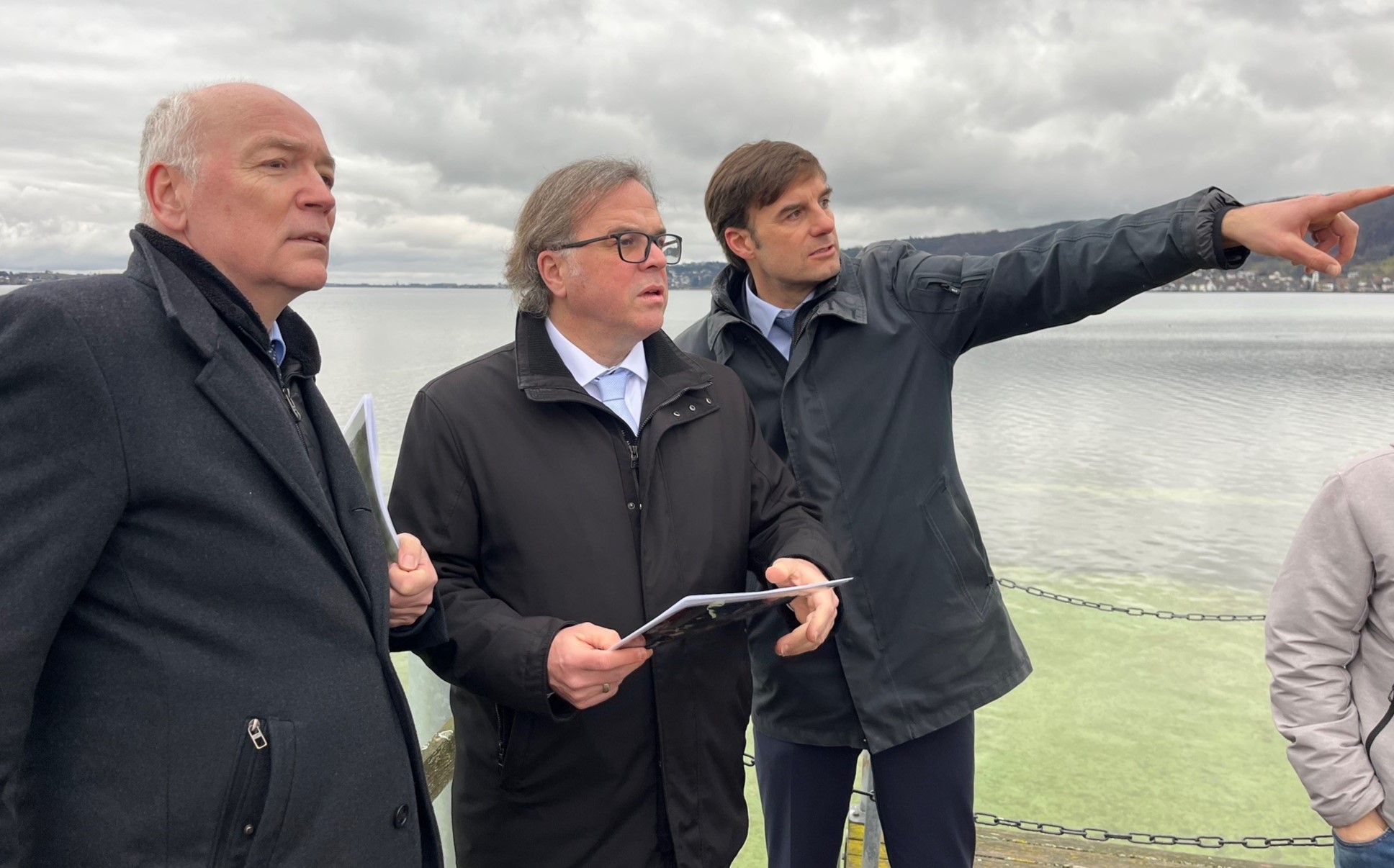 Den Abschluss bildete eine Vor-Ort-Begehung in Horn, bei der Landrat Danner, Erster Landesbeamter Philipp Gärtner, Bürgermeister Jürgen Maas sowie Vertreter der Gemeinde Gaienhofen mit Regierungspräsident Gabbert über die Ufernutzung diskutierten. Im Mittelpunkt standen der freie Zugang zum Ufer und die Nutzung des Hafens.