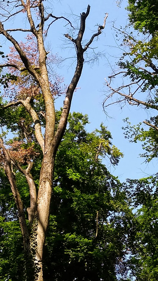 Das Bild zeigt eine alte Buche mit dürrer Krone.