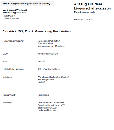 Der Flurstücksnachweis enthält für ein Flurstück insbesondere seine Verwaltungszugehörigkeit zu Flur, Gemarkung, Gemeinde und Kreis sowie Lage, amtliche Fläche, Angaben zur Bodennutzung und darauf liegenden Gebäuden. Auch ob und wo das Flurstück im Grundbuch zugeordnet ist, wird dargestellt.